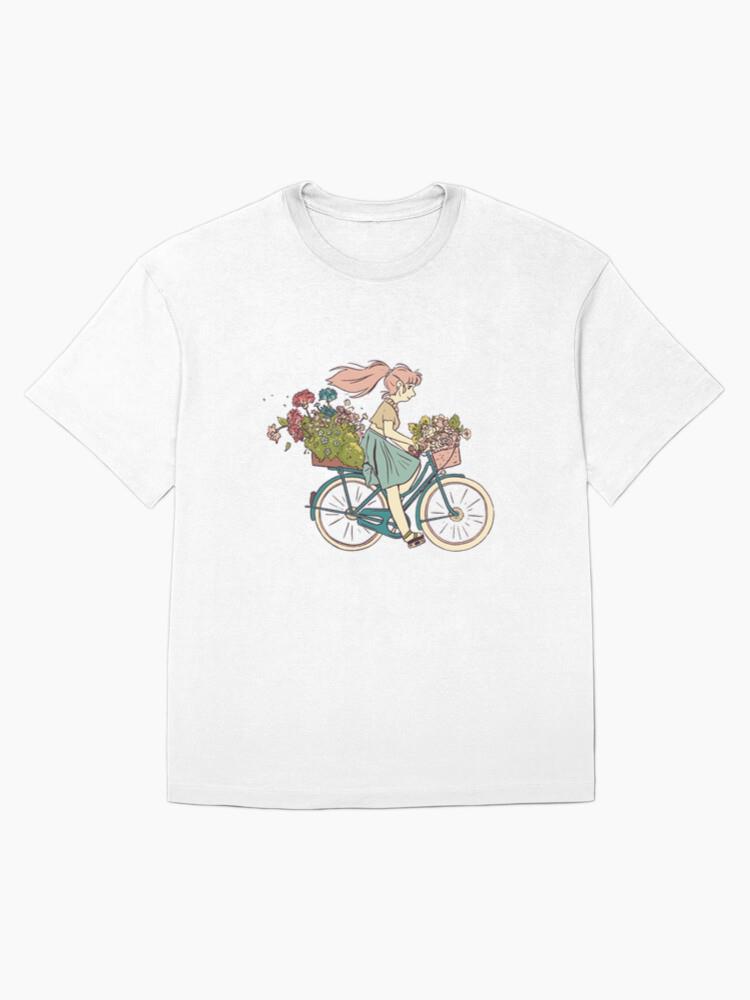 Comfy, casual, and always in style, this Girl Riding A Bike With Flowers T-Shirt T-shirt is perfect for daily wear or easy gifting.