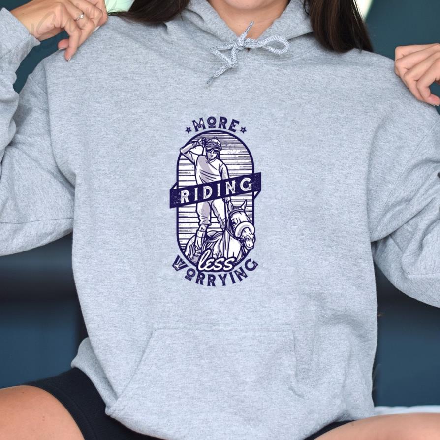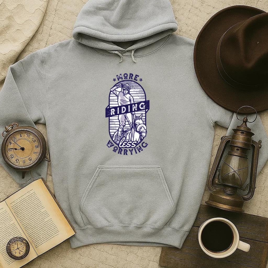The More Riding Less Worrying Hoodie hoodie combines comfort warmth and style for a go anywhere piece that works in any season. Soft inside and durable outside it is perfect for layering or lounging